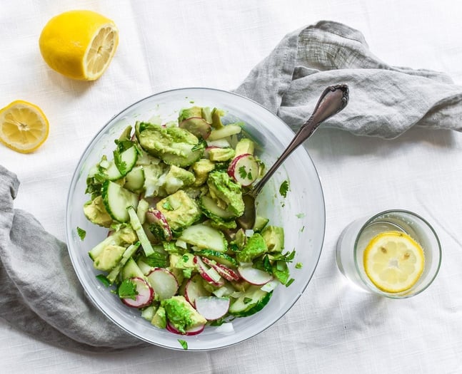 For this versatile recipe, radishes and baby cucumbers are thinly sliced and added to a bowl of diced avocado. A touch of lemon and salt, and this recipe is complete.