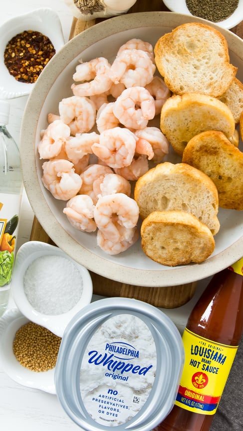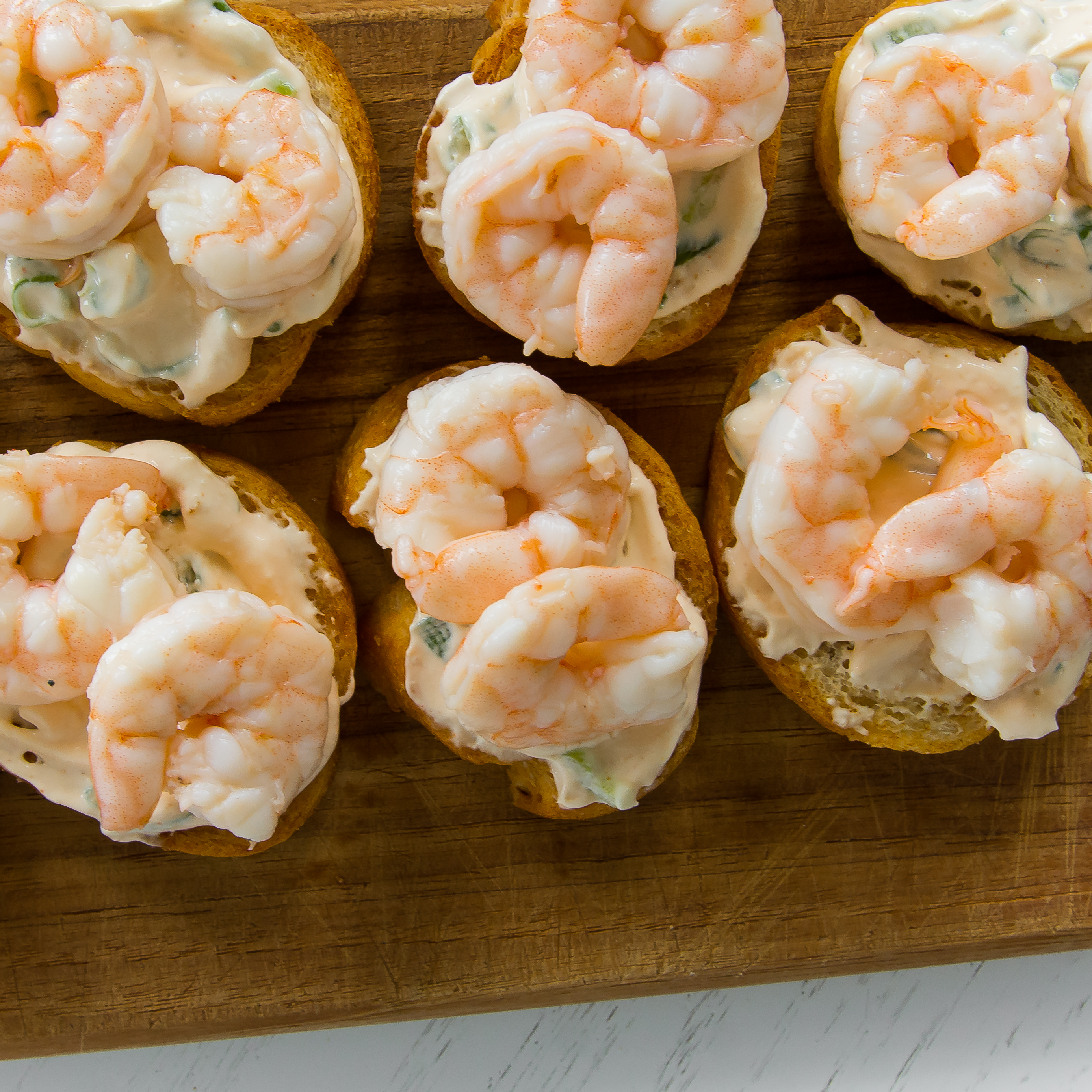 Smother toasted baguettes with spicy-cheddar cream cheese dip and top with pickled shrimp.